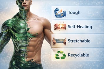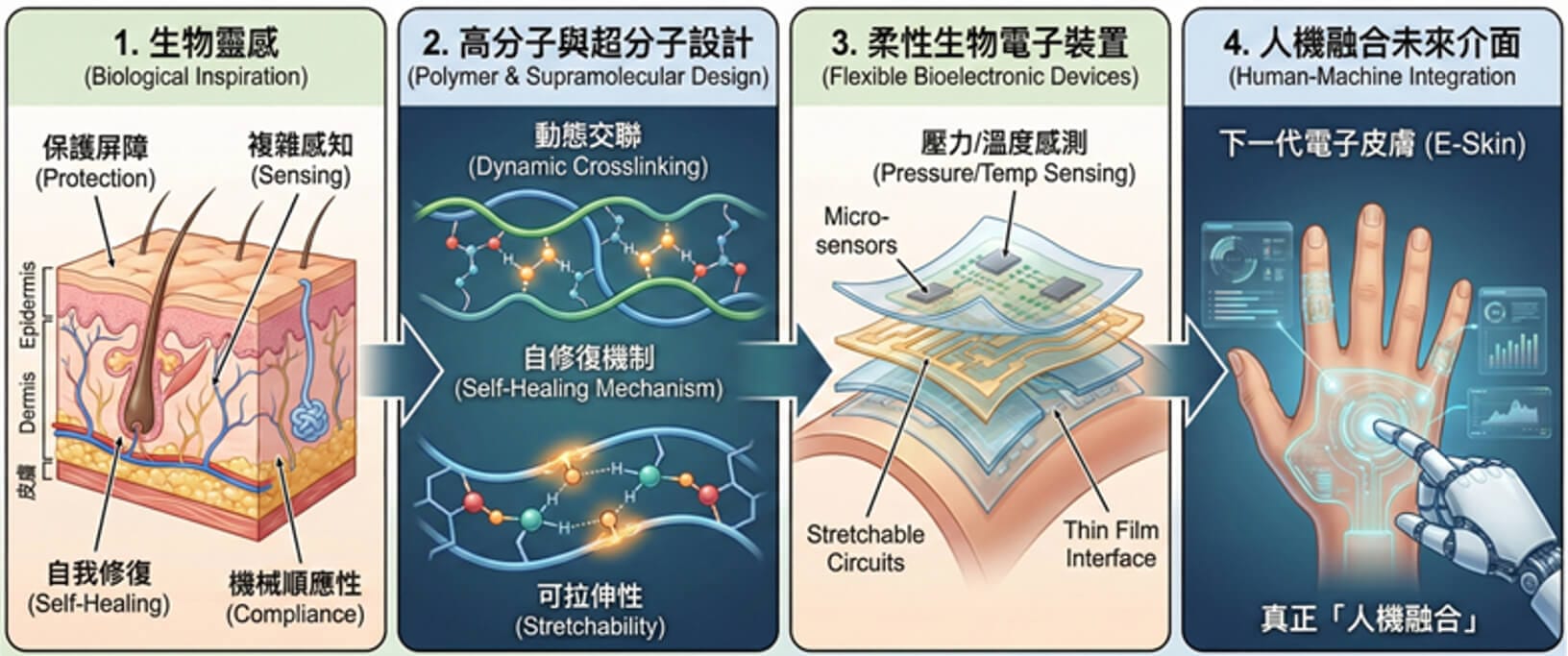 本研究團隊聚焦於高功能高分子彈性體與電子皮膚(e-skin)材料的設計與開發,以人體皮膚所展現的多重功能為設計靈感,致力於建立兼具高延展性、自修復性、感測能力與生物相容性的先進材料與裝置。皮膚作為人體面積最大的器官,同時具備保護、感知、自我修復與優異機械順應性,為新世代電子皮膚材料提供了重要的仿生藍本。本團隊透過可調控鏈段組成與動態交聯的高分子與超分子彈性體設計,實現接近皮膚柔軟度的高延展性與足以承受外力的機械強度,並藉由金屬配位、氫鍵、離子鍵、π–π 作用與動態共價鍵等分子互動,賦予材料快速自修復特性、可調控的黏彈行為與微相結構,同時兼顧材料的可回收性與永續循環應用。在此基礎上,本團隊進一步開發皮膚般的感測材料,製備可拉伸、可自修復且高靈敏度的多模態感測元件,涵蓋壓力、應變與溫度感測,並應用於貼附式穿戴裝置與具良好生物相容性的界面材料,朝向高整合度與實際應用導向的電子皮膚系統邁進。