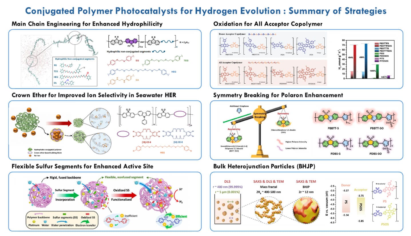 透過模仿天然光合作用,利用高分子光催化劑在可見光照射下進行水分解以產生氫氣,被視為一種兼具環境友善、高能量密度且能有效轉換豐沛太陽能的理想策略。為尋找能模擬此功能的高效光催化材料,本研究團隊致力於開發新型高分子、共價有機框架材料(COF)、以及高分子點(Pdots)作為光催化水產氫的活性材料。本研究團隊著重於分子結構設計、光物理性質、理論計算、反應機制探討及氫氣應用等面向。除了分解水產氫,本團隊亦積極發展光重整(photoreforming)技術,以可見光驅動高分子光催化劑將塑膠廢棄物、生質基質或各類有機汙染物轉化為氫氣及高附加價值化學品。光重整可同時達成廢棄物處理與能源產生,不僅具有更高的能量利用效率,也為循環經濟與永續化學提供前瞻性的解決方案。此外,本團隊也對利用功能性高分子進行二氧化碳光還原與全水分解反應有高度興趣,期望整合多元光催化策略,拓展人工光合作用在能源轉換與永續資源利用領域中的應用。