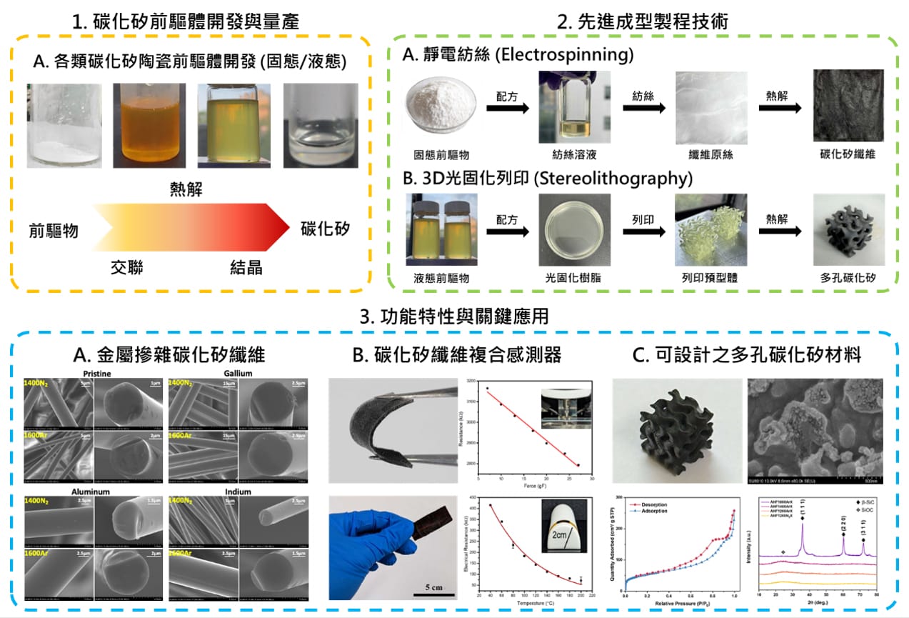 本研究團隊以碳化矽前驅體技術為核心,自固態至液態前驅物皆具備完整的合成開發、純化流程與量產技術。透過深入掌握前驅體的反應路徑、化學組成與熱解行為,團隊建立了一套可支援後續成形與高溫轉換的完整材料供應平台。在成型製程方面,本團隊整合靜電紡絲與 3D 光固化列印兩項先進技術,使前驅物得以分別形成連續纖維與具複雜幾何的三維結構,並於熱解後轉換為高溫穩定的碳化矽陶瓷。藉由配方與製程參數的設計,本研究團隊可製備多樣形貌並具可調組成的碳化矽材料,以滿足不同應用對結構與性能的需求。在應用導向上,本團隊著重於功能性碳化矽材料之開發,包括金屬摻雜以提升耐高溫性能的碳化矽纖維、可整合壓阻或熱響應的複合式感測元件,以及具高比表面積與可設計性之多孔碳化矽結構,可應用於催化反應、極端環境操作等高要求場域。透過「前驅體開發 → 成型技術 → 功能應用」的串接,本研究團隊已建立起一條從化學合成到工程應用的完整碳化矽材料技術鏈。